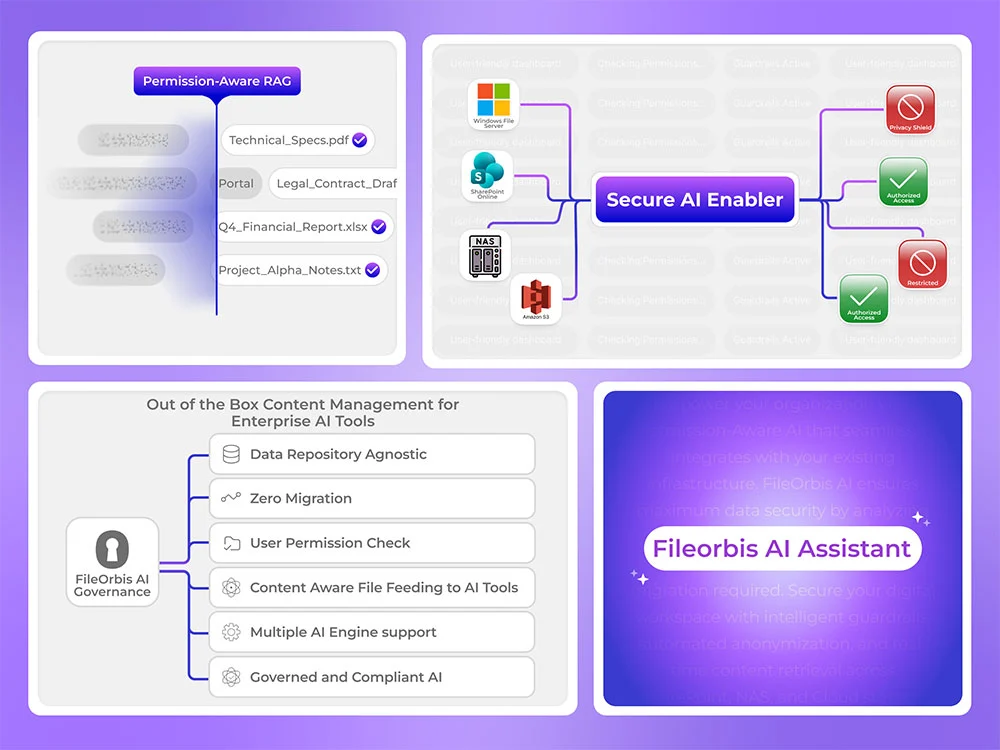 Unlike traditional solutions that flatten permissions and risk internal data leakage, FileOrbis dynamically filters document access based on user-specific ACLs. If a user does not have permission to open a file in Windows or SharePoint, the AI behaves as if that document does not exist.
