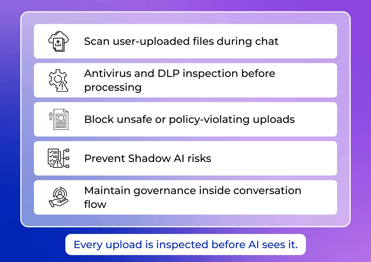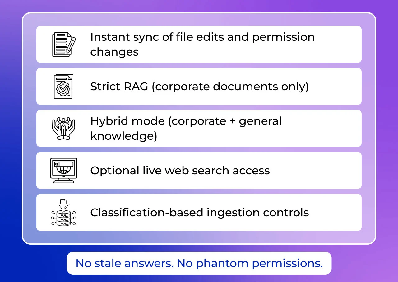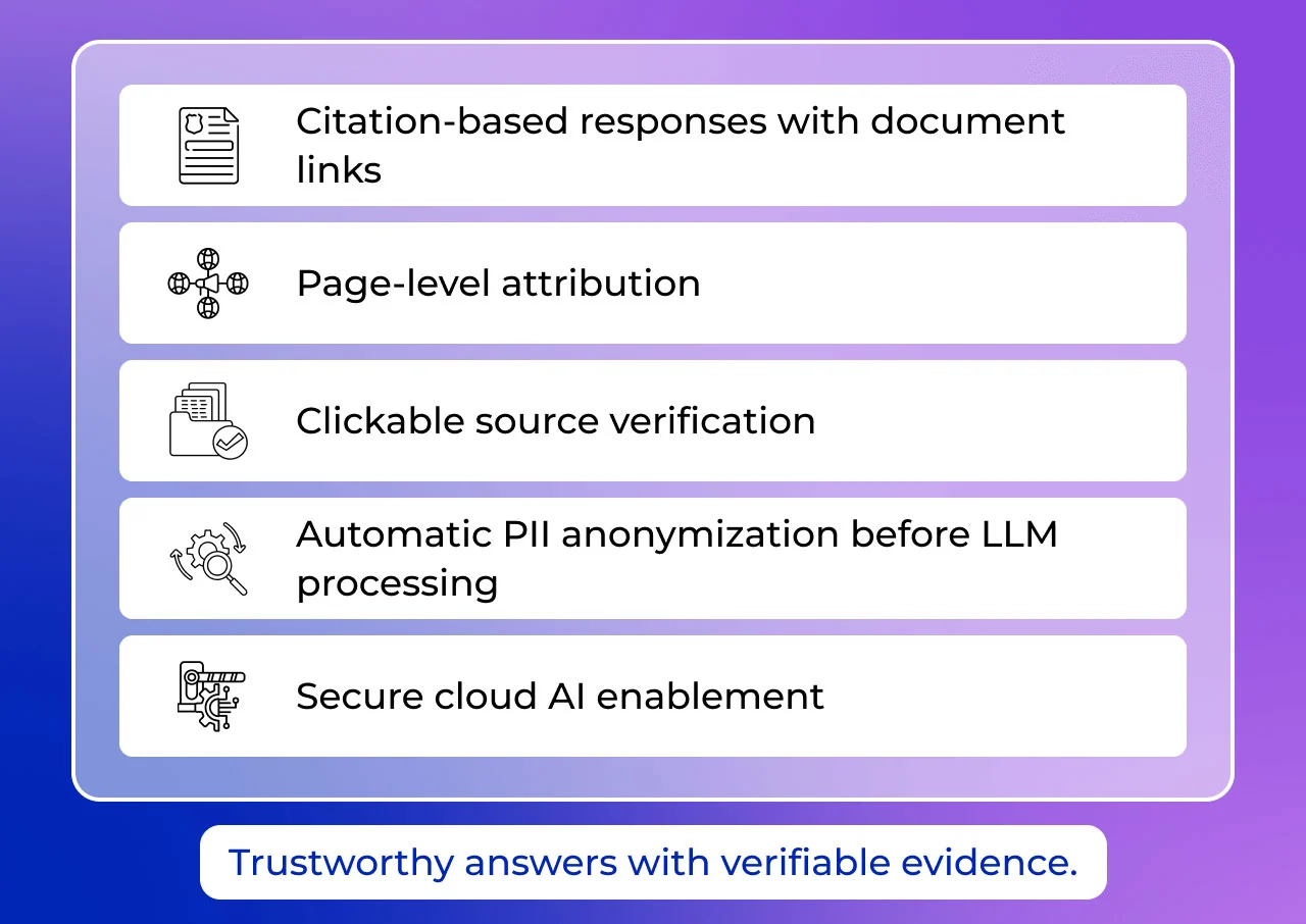 The platform also governs chat-time file uploads, enforces topic guardrails, sanitizes sensitive data through anonymization, and provides citation-backed responses for full transparency. The result is accurate, compliant, and secure AI adoption across Microsoft Teams or Web—without data migration or vendor lock-in.