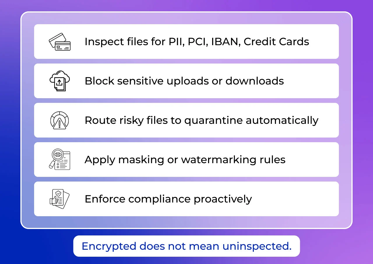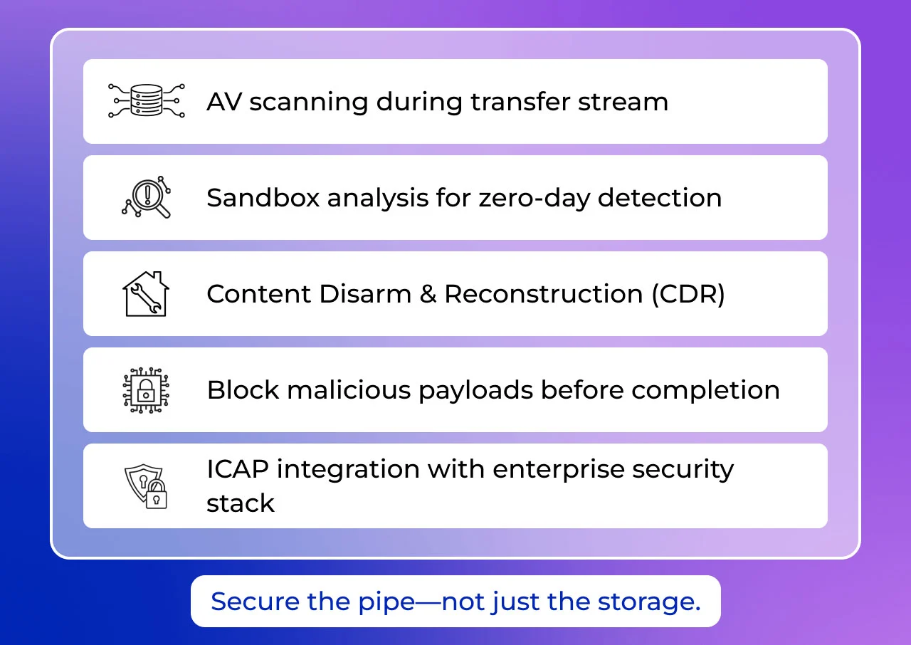 It inspects encrypted transfer streams in real time, applying AV, Sandbox, and DLP controls before files are stored.