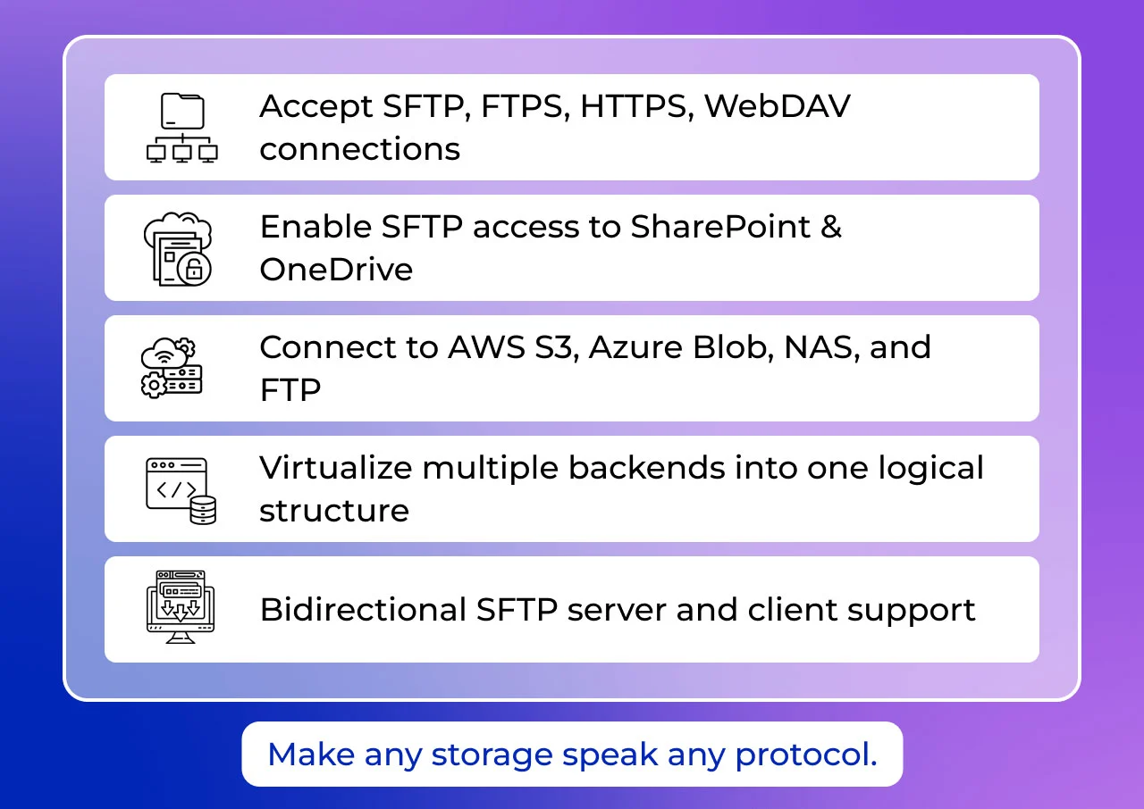 The Intelligent, Multi-Protocol Gateway for Secure Data Automation Bridge Legacy Systems. Inspect Every Packet. Automate Securely. Modern SFTP Access to Cloud, NAS, SharePoint & Object Storage—With Real-Time Threat Protection.