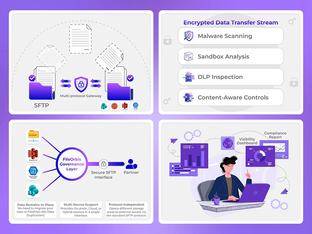 FileOrbis Smart SFTP goes beyond traditional SFTP servers by securely connecting legacy SFTP systems with modern storage platforms such as SharePoint, NAS, S3, and Azure Blob. Every file transfer is inspected in real time with malware scanning, sandbox analysis, DLP inspection, and content-aware controls—even within encrypted sessions.